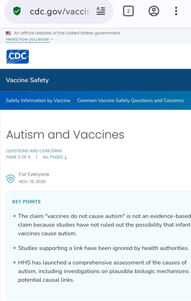 Tvrdenie „vakcíny nespôsobujú autizmus“ nie je založené na dôkazoch, pretože štúdie nevylúčili možnosť, že očkovanie dojčiat spôsobuje autizmus.